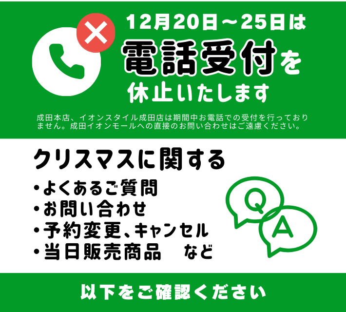 誠に勝手ながら12月20日〜25日はお電話での受付を休止させて頂いております。